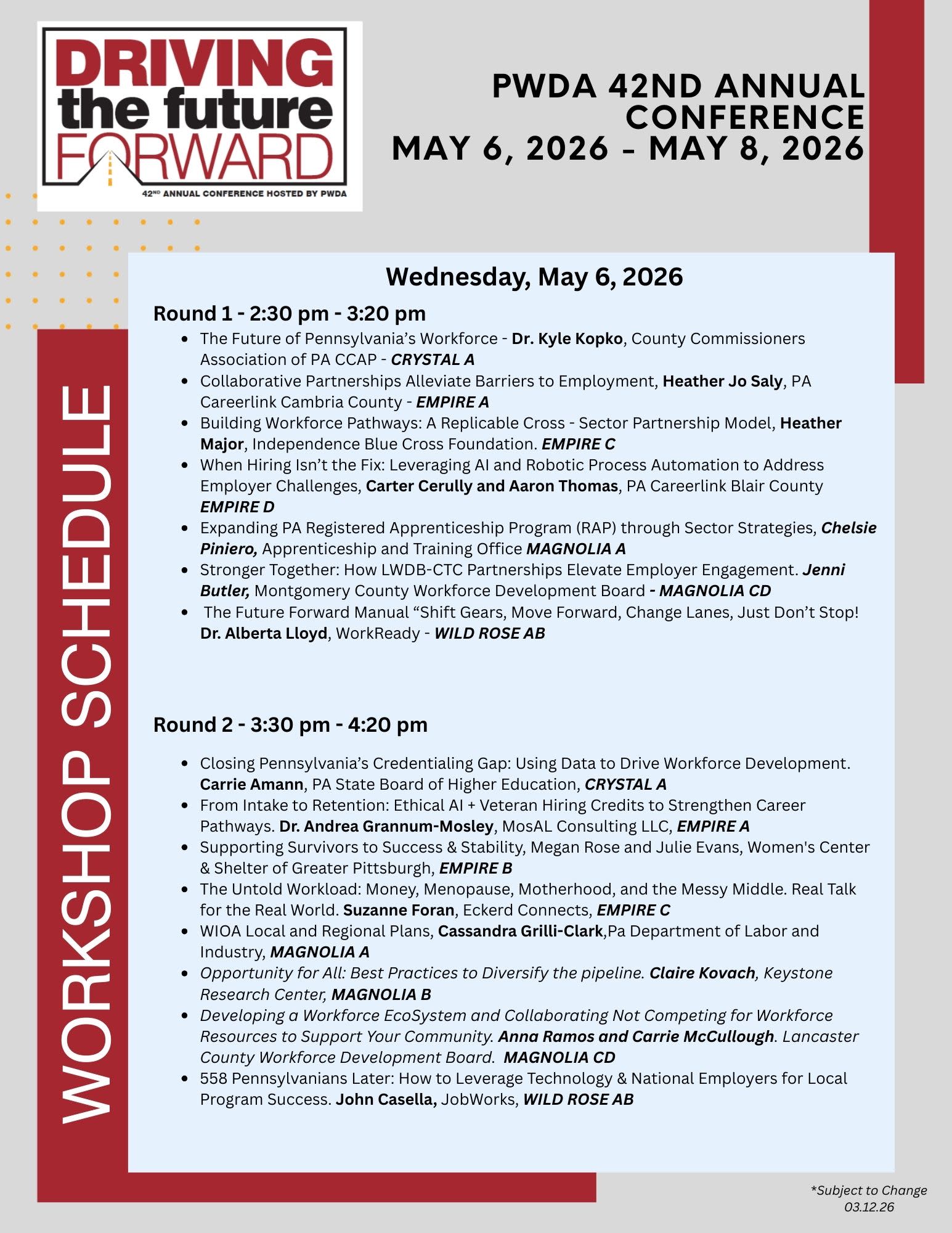 WORKSHOP SCHEDULE 2026