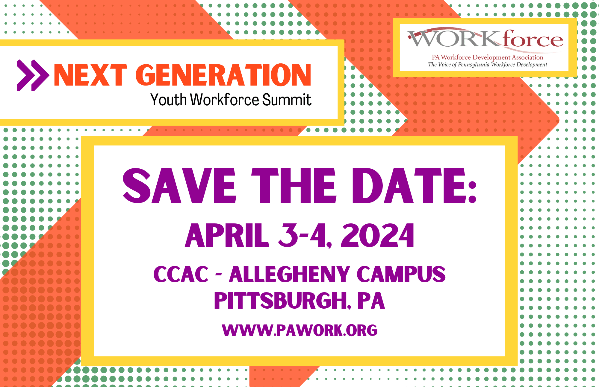 The Next Generation Youth Workforce Summit will bring together Pennsylvania youth program providers across workforce development, higher-education, K-12, youth job coaches, community-organizations, and other professionals who serve youth - to network with peers, share ideas and experiences, and discover new and innovative programs, products, and services.